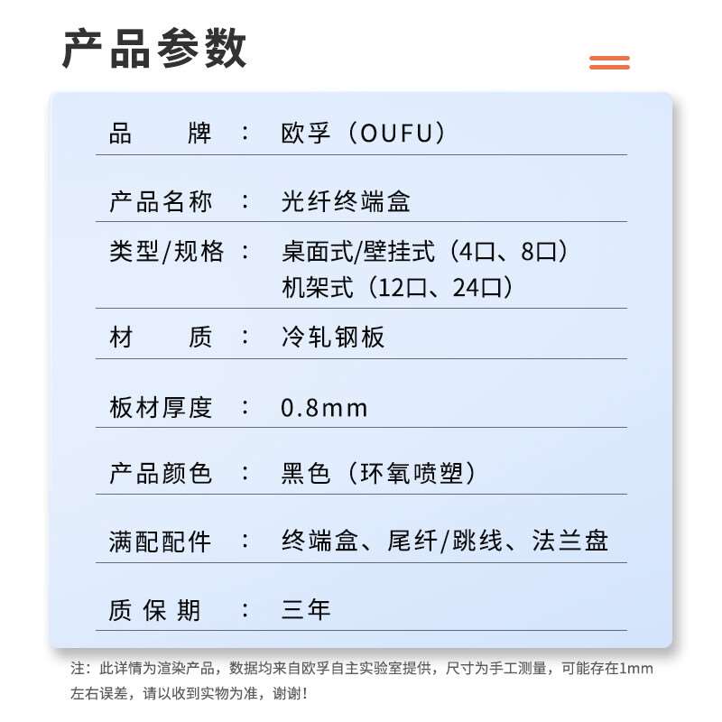 欧孚满配光纤终端盒采用品牌A级纤芯光纤、A级陶瓷插芯及电信级法兰盘,只需要熔接即可使用方便快捷,提高工作效率的同时也确保了数据的稳定性。