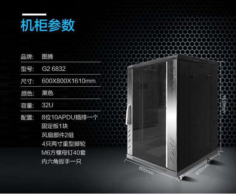• G2——玻璃门。 G3——网孔门。 6832——600*800*1610mm。 *注:机柜可定制玻璃门/网门。
